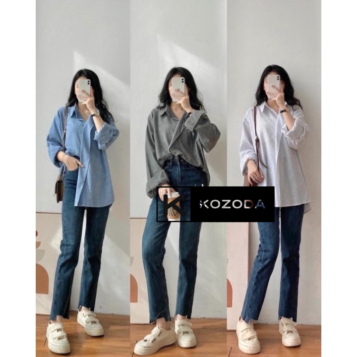Freeship- Áo sơ mi nữ form rộng kẻ cổ vest dài tay ba màu đen trắng xanh phong cách Hàn Quốc mùa thu 2021 Kozoda SM46 mua tại đây